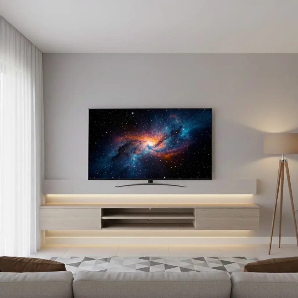 طراحی این تلویزیون مدرن و جذاب است؛ حاشیه‌های باریک، ضخامت مناسب و طراحی پایه‌ای که به راحتی روی میز قرار می‌گیرد یا به دیوار نصب می‌شود، باعث می‌شود در فضای خانه برجسته دیده شود. استاندارد نصب دیواری VESA نیز تأمین شده است تا انعطاف بیشتری در چیدمان داشته باشید.