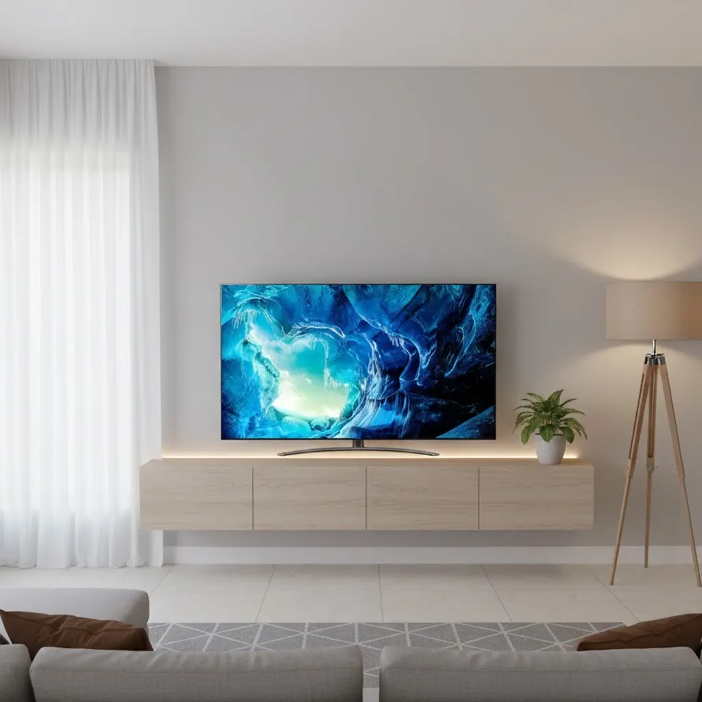 سیستم صوتی این تلویزیون دارای توان خروجی تا حدود ۶۰ وات با آرایش 4.2 کانال و پشتیبانی از فناوریهایی چون Dolby Atmos و AI Sound Pro است. این سطح صوتی همراه با تصویر 8K تجربهای فراگیر برای تماشای فیلم و محتواهای بلندمدت فراهم میکند. اگر فضای نشیمن بسیار بزرگ دارید یا به سیستم صوتی حرفهای میل دارید، میتوانید آن را با ساندبار یا اسپیکرهای مجزا تقویت کنید.